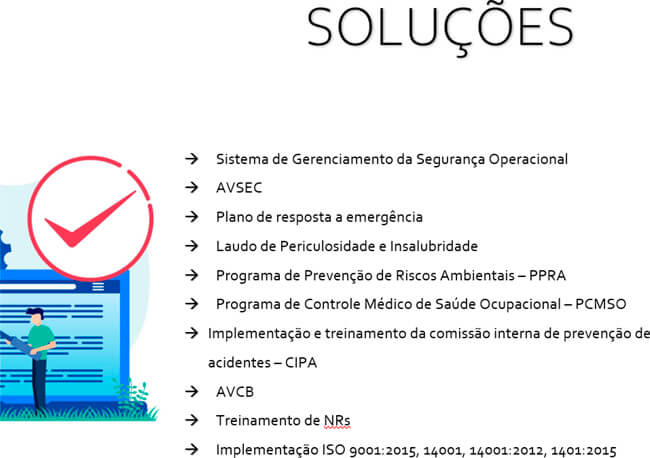 A consultoria de segurança e qualidade tem como objetivo principal analisar possíveis danos à segurança que uma empresa ou projeto podem causar e orientar nossos clientes no cumprimento da legislação, boas práticas, responsabilidade, segurança, sustentabilidade e adoção de uma cultura de qualidade contínua.
